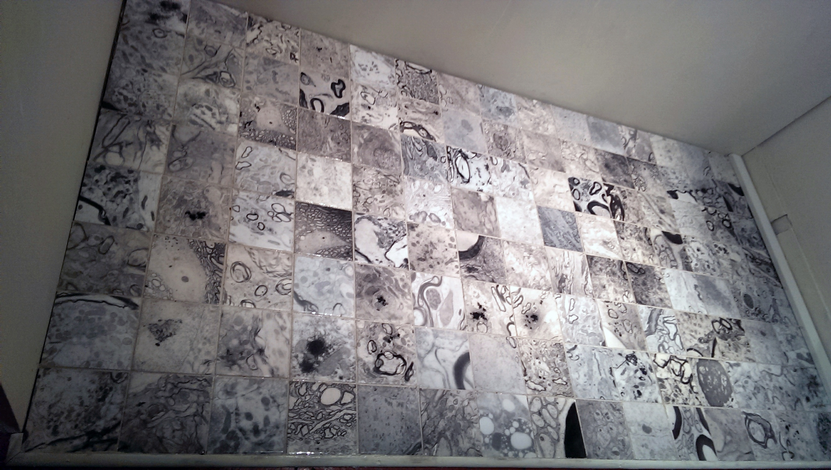 This floor is made from 6 inch tiles with photos of cells, many of them cancerous, glued on them and then covered in resin so they look like shiny marble tiles. Here it is shown as part of a larger installation for the Day of the Dead show in SOMArts in San Francisco. The floor, like the larger installation, is a collaboration between myself and Ytaelena Lopez.