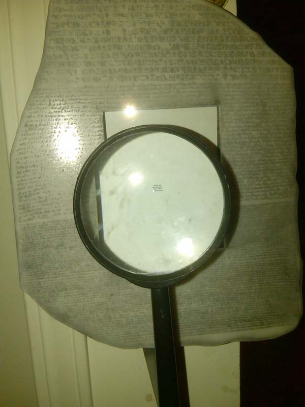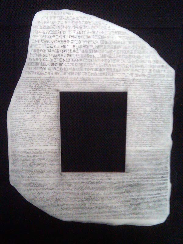 Here I’ve cut the acrylic and etched to make it like the Rosetta stone. I experimented with some graphite powder to make the etched text somewhat visible, while also giving a slight gray tint to the piece. I may try other options – I saved the cut-out center piece for tests. Here is a prototype of what the finished piece will look like: