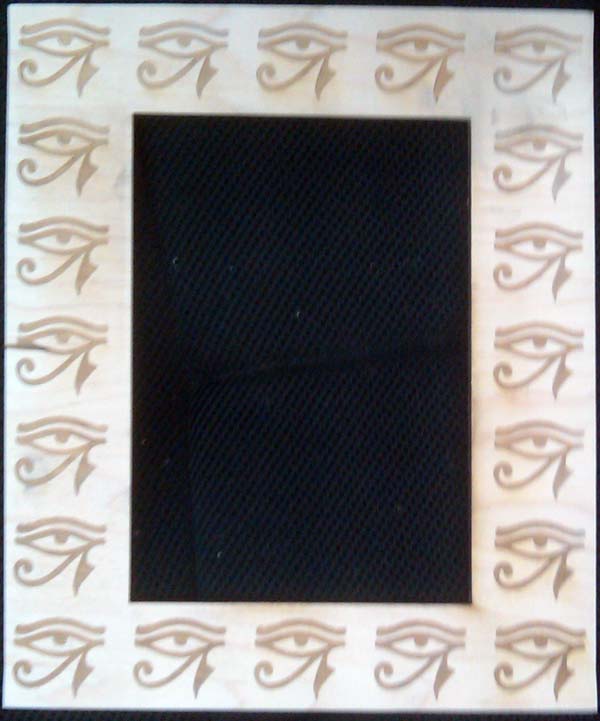 This one is wood – forgive the awful camera-phone photo. It was a pain the neck – two passes didn’t fully cut through everywhere, though they should have given my test pass. I had to use a palm sander for a LONG time on the back side to thin the material down to the point where the cut went through on the front side (thanks to Terry at TechShop for the suggestion). The text that will go in the frame, behind a magnifying glass, is “Does the voice in your head sound like this?”